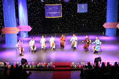 文藝晚會以馬頭琴曲《黑幕日》作為開場曲目,詩歌朗誦節(jié)目《美麗內(nèi)蒙古,我的家鄉(xiāng)》表達(dá)了各族同學(xué)愛黨愛國愛疆的深切情懷,而多姿的民族舞充分展現(xiàn)了民族文化與風(fēng)情,學(xué)生們自編自導(dǎo)自演的小品則讓觀眾開懷大笑。晚會進(jìn)入高潮后,一首男生獨(dú)唱《黨的恩情》唱出了各族師生對實(shí)現(xiàn)中華民族偉大復(fù)興中國夢的堅(jiān)定信念和滿懷信心。最后,晚會在四重唱《為內(nèi)蒙古喝彩》的歌聲中圓滿落幕。
