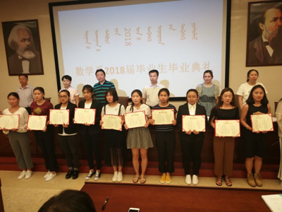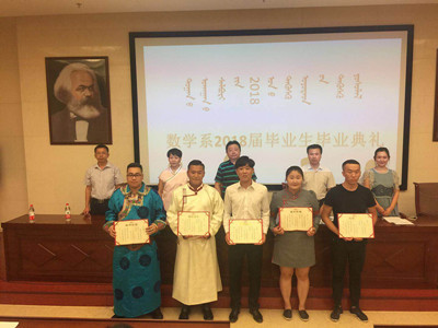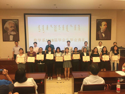 典禮在莊嚴(yán)的國歌聲中正式開始。首先,額爾敦其其格副主任宣讀畢業(yè)本科生名單。隨后,王海清副主任宣讀《關(guān)于數(shù)學(xué)系第二屆師范生模擬課堂教學(xué)技能大賽獲獎(jiǎng)學(xué)生的表彰決定》、《關(guān)于對數(shù)學(xué)系2018屆畢業(yè)生若干獎(jiǎng)項(xiàng)進(jìn)行表彰的決定》和《關(guān)于數(shù)學(xué)系第五屆青年教師課堂技能大賽獲獎(jiǎng)教師的表彰決定》,并為獲獎(jiǎng)師生頒發(fā)榮譽(yù)證書。本次典禮表彰了烏尼日等23名分別榮獲數(shù)學(xué)系第二屆師范生模擬課堂教學(xué)技能大賽一、二和三等獎(jiǎng)的同學(xué);授予了考取碩士研究生的黃蕊、風(fēng)景和趙彩霞等三名同學(xué)為數(shù)學(xué)系2018年度“學(xué)習(xí)之星”榮譽(yù)稱號;授予了包文靜等10名同學(xué)“優(yōu)秀畢業(yè)生”榮譽(yù)稱號;授予了道仁騰格爾等5名同學(xué)“優(yōu)秀學(xué)生干部”榮譽(yù)稱號;表彰了白雪等7名優(yōu)秀實(shí)習(xí)生和額敦呼等10名小學(xué)數(shù)學(xué)教師基本功考核優(yōu)秀學(xué)生;表彰在數(shù)學(xué)系第五屆青年教師課堂技能大賽中獲獎(jiǎng)的青梅等9名教師。