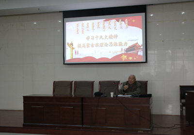 為深入學習貫徹黨的十九大精神,提高理論思維能力,12月14日15時,法律系邀請內蒙古師范大學格?孟和教授在圖書館三樓模擬法庭作了題為《學習十九大精神,提高蒙古族理論思維能力》的專題講座。講座由法律系主任包山虎主持,全系教師和法學專業學生代表共計60余人參加。