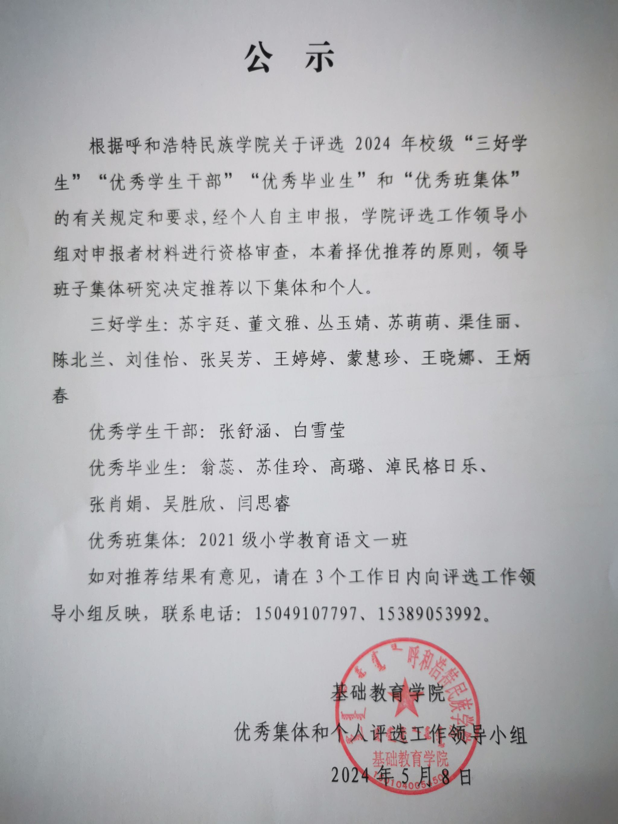 基礎教育學院評選“三好學生”“優秀學生干部”“優秀畢業生”和“優秀班集體”結果公示 為全面貫徹黨的教育方針,以鑄牢中華民族共同體意識為工作主線,培養和造就社會主義事業合格建設者和接班人,促進大學生提高自身素質,充分發揮先進典型示范引領激勵作用,呼和浩特民族學院開展了2024年校級“三好學生”“優秀學生干部”“優秀畢業生”和“優秀班集體”評選工作?;A教育學院評選工作領導小組對申報者材料進行資格審查、本著擇優推薦的原則,評選結果公示如下: