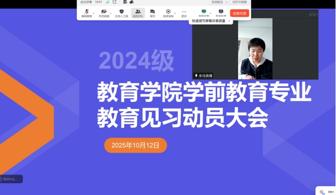 2025年10月12日,學前教育專業線上召開教育見習動員大會。會議由教育學院副院長朱烏英嘎主持,2024級學前教育專業全體學生、班主任及教育見習全體指導教師參與會議。本次大會為2024級學前教育專業學生即將開展的教育見習工作進行了全面動員和部署。