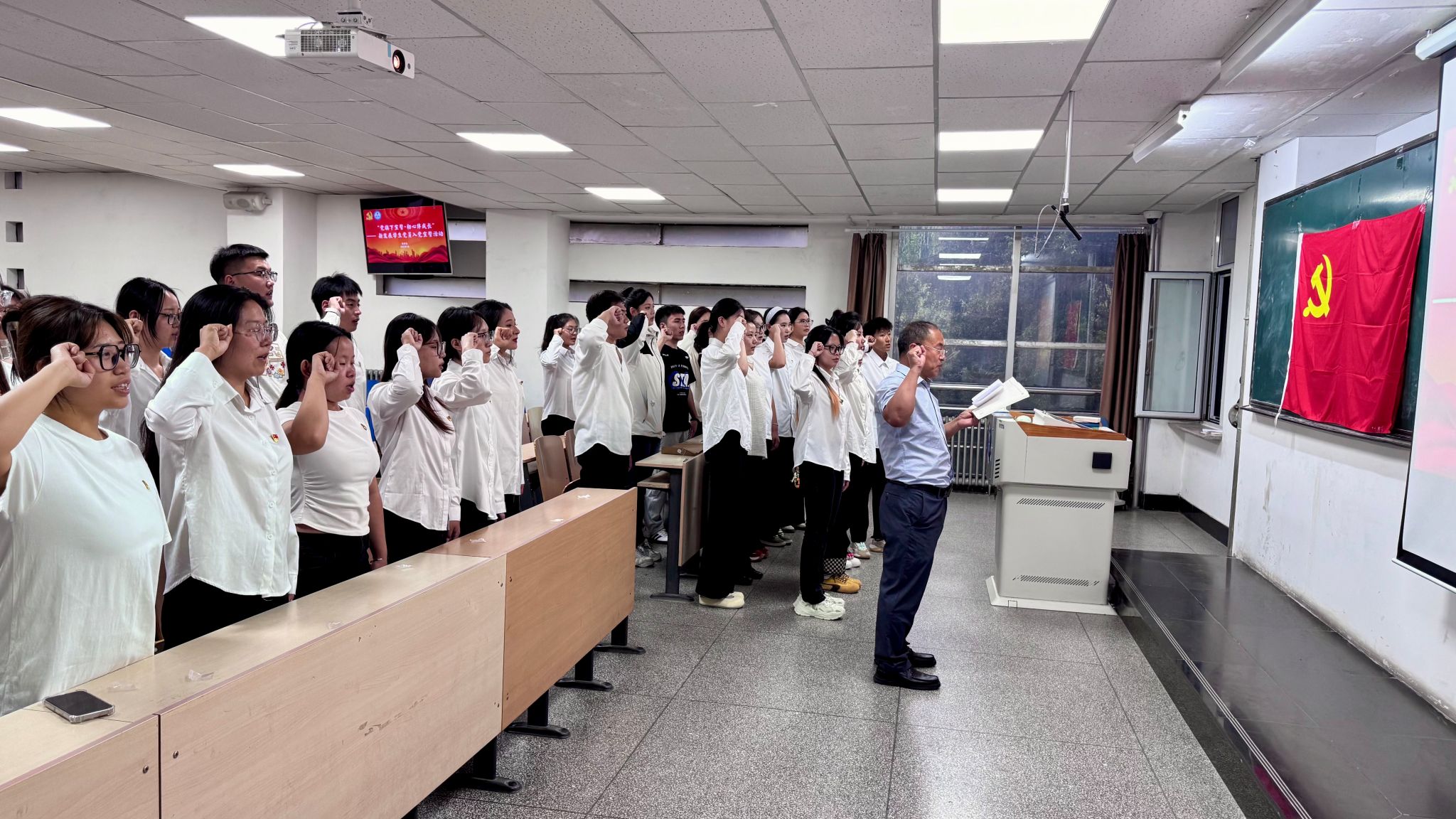 最后,在樊寒偉老師的領誓下,全體新黨員面向鮮紅的中國共產黨黨旗,高舉右拳,莊嚴宣誓:“我志愿加入中國共產黨,擁護黨的綱領,遵守黨的章程……”,這不僅是對黨的忠誠承諾,更展現了新時代青年黨員的堅定信念與昂揚風貌。