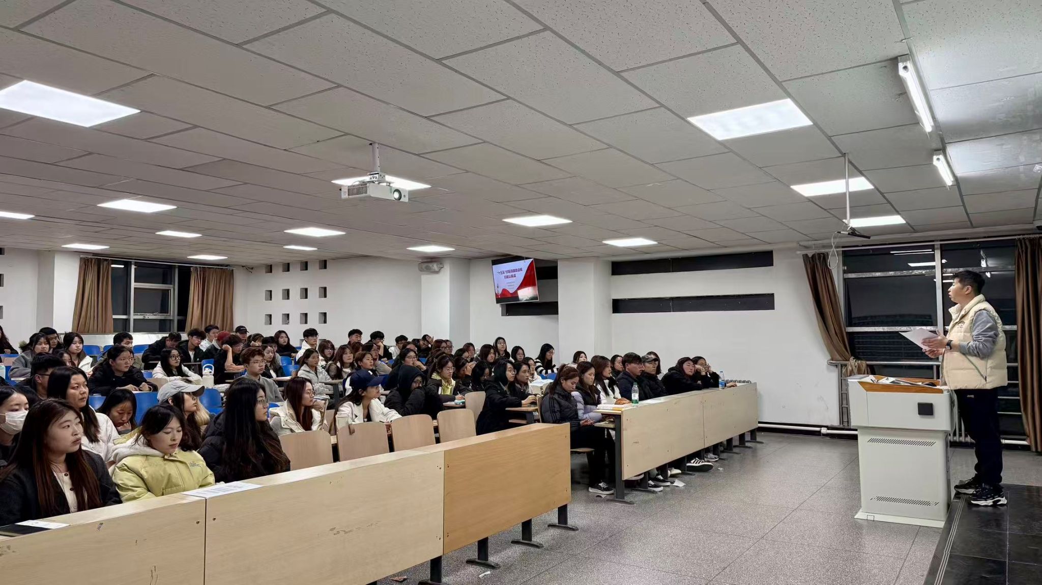 活動伊始,黨支部書記華國慶以“深學細悟明方向,凝心聚力建新功”為主題,圍繞黨的二十屆四中全會的召開背景、重大意義、核心部署以及對青年成長的時代要求,進行了系統且全面的闡釋。在解讀“推進國家治理體系和治理能力現代化”“深化高質量發展舉措”等關鍵內容時,緊密結合商學院專業特色,將宏觀政策與學生密切關注的就業創業、行業發展、社會實踐等實際問題深度融合,運用鮮活案例剖析抽象理論,切實激發了學生的學習熱情與思考主動性。
