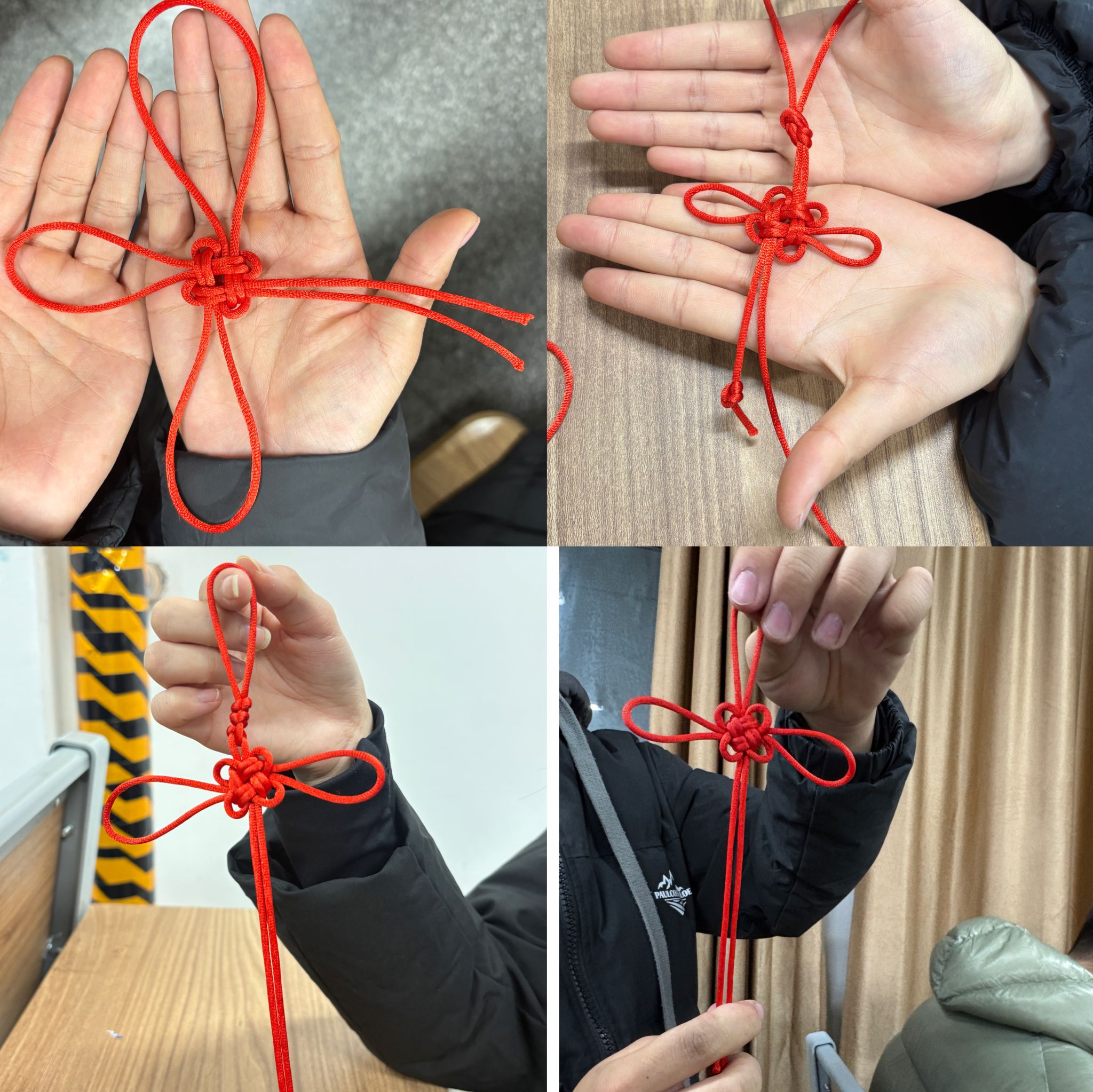活動伊始,學(xué)生會成員向同學(xué)們介紹了中國繩結(jié)的悠久歷史與文化內(nèi)涵。從寓意吉祥的盤長結(jié)到小巧精致的吉祥結(jié),每一個承載著美好祝愿的繩結(jié)樣式,都引發(fā)了在場同學(xué)對這一非遺技藝的濃厚興趣。同學(xué)們紛紛拿起紅繩,認真鉆研。起初操作生疏,而后漸趨熟練。在反復(fù)的穿引、纏繞過程中,一根根普通的紅繩逐步轉(zhuǎn)變?yōu)橐粋€個精巧的繩結(jié)。活動現(xiàn)場大家相互交流技巧、分享創(chuàng)作心得。小小的繩結(jié)不僅連接起絲線,更拉近了彼此間的距離。一根根普通的紅繩,在同學(xué)們手中幾經(jīng)纏繞、穿插,最終成為一個個精巧別致的繩結(jié)。當(dāng)看到自己親手制作的繩結(jié)作品時,大家的臉上都洋溢著滿滿的成就感。