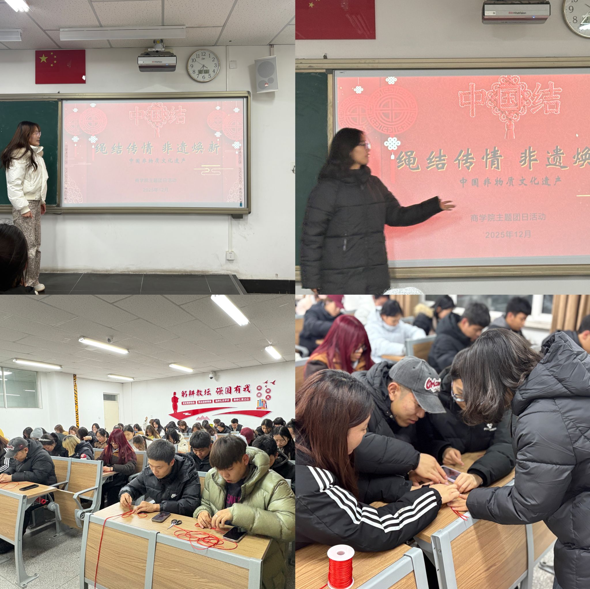 為深入學(xué)習(xí)并落實有關(guān)“加強非物質(zhì)文化遺產(chǎn)保護傳承”“推動中華優(yōu)秀傳統(tǒng)文化創(chuàng)造性轉(zhuǎn)化、創(chuàng)新性發(fā)展”的重要部署,傳承中華優(yōu)秀傳統(tǒng)文化,豐富校園文化生活,12月8日,商學(xué)院團總支在尚智樓204教室舉辦“繩結(jié)傳情,非遺煥新”主題團日活動,引領(lǐng)同學(xué)們感受繩結(jié)技藝的獨特魅力。