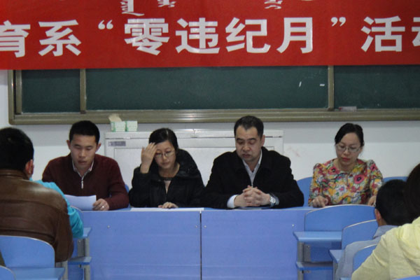 為了加強(qiáng)學(xué)生管理工作,于2013年3月14日晚7:30在新教學(xué)樓418教室舉行了“零違紀(jì)月”活動(dòng)的啟動(dòng)儀式,參加本次活動(dòng)的有院學(xué)生處蘇龍高娃老師、蘇日高格老師,教育系胡寶泉老師、許曉芳老師、王慧東老師及全體學(xué)生。