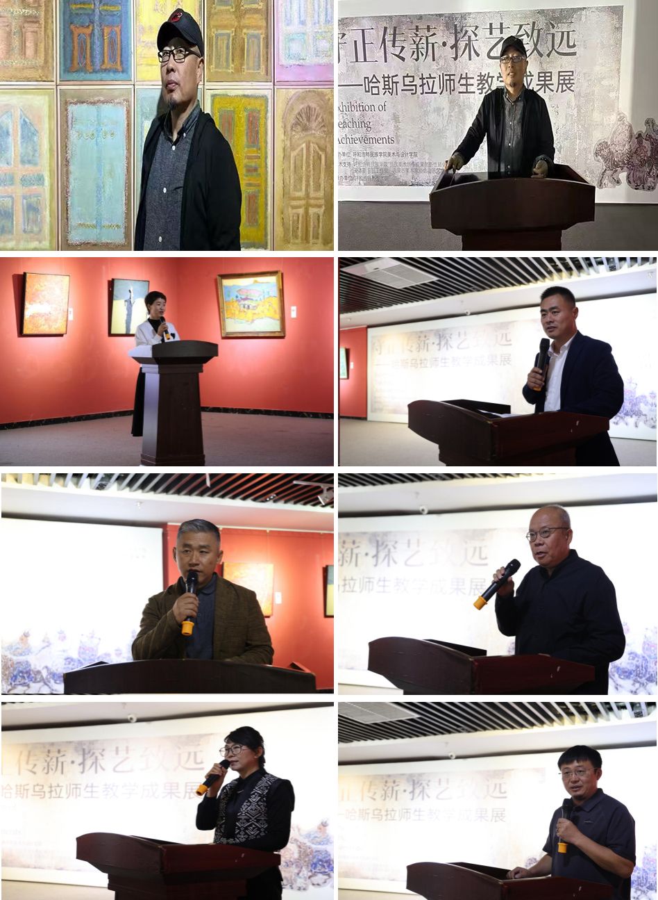 展覽以“凝練教學實踐”與“傳承藝術文脈”為雙核驅動力,呈現了一段關于藝術堅守、薪火傳遞與創新開拓的成長旅程,為區域美育事業發展注入新的活力。開幕式上,美術與設計學院院長高特木樂、內蒙古自治區美術家協會副主席于江、著名評論家,內蒙古藝術學院王鵬瑞教授、呼和浩特市美術館副館長郭劍利、現就職于土默特左旗第一小學的學生代表杭蓋及哈斯烏拉老師本人先后致辭,共同分享了對美術教育與民族藝術傳承的深度思考。
