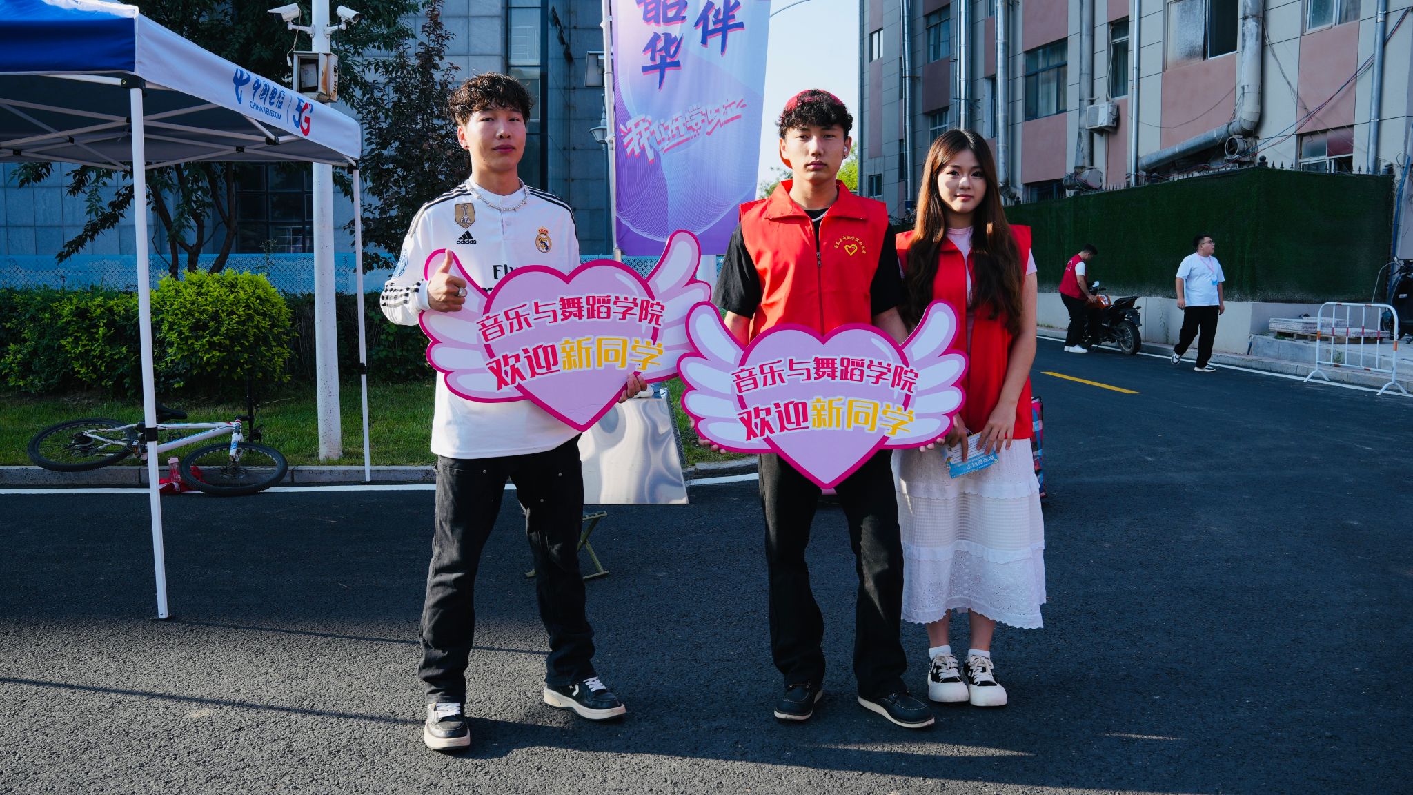 校門口,熱烈的迎新氣氛撲面而來。彩色的拱門熱情洋溢,新同學與吉祥物合影留念,高高舉起的指示牌向新同學展示著學長學姐的關愛。