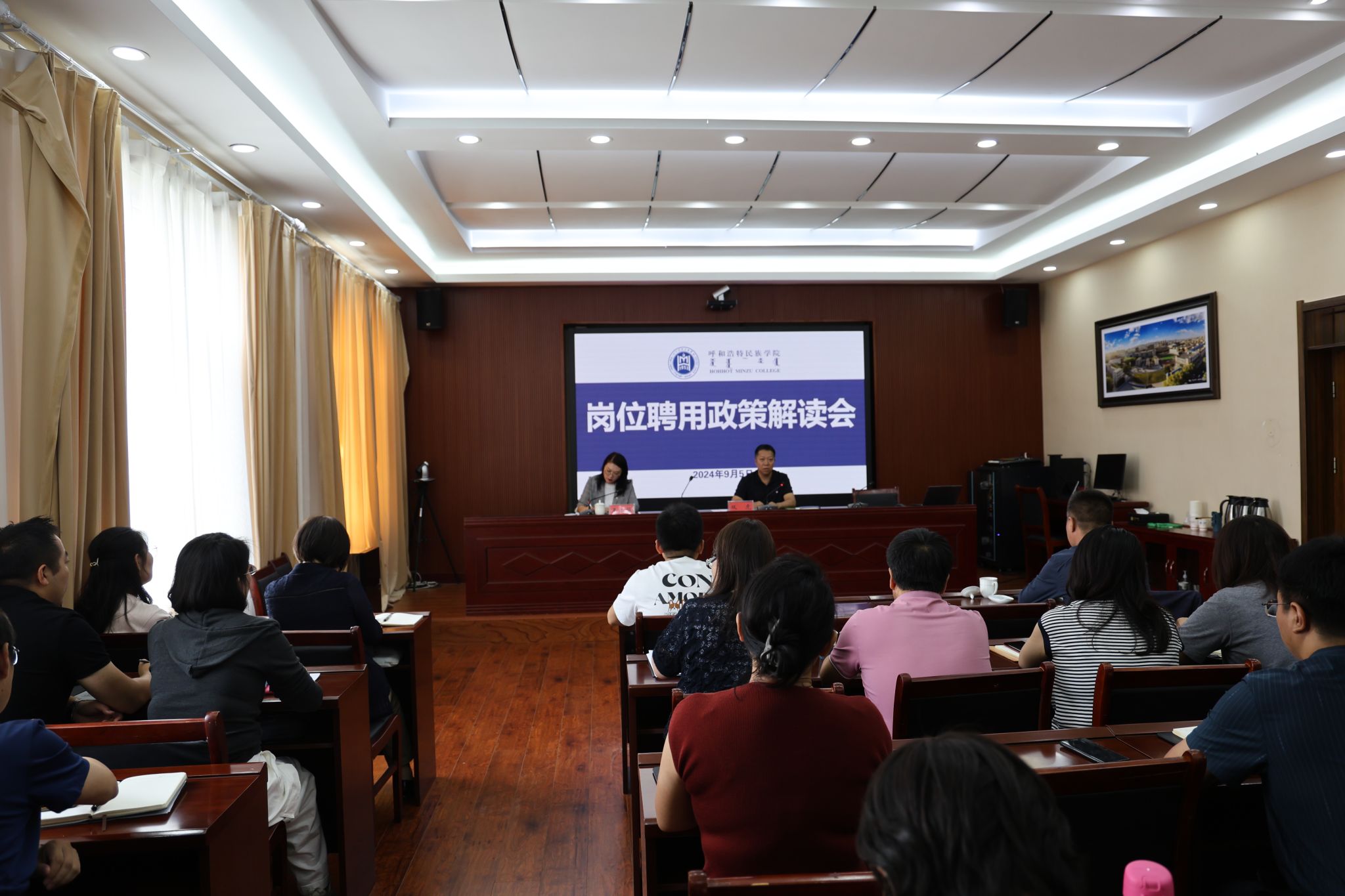9月5日,學校在辦公樓四樓會議室召開崗位聘用工作政策解讀會,并布置近期學校人事相關工作。校黨委委員、副校長雙虎出席會議,各學院、部門負責人及工作人員參加會議。人事處處長王小梅主持會議。