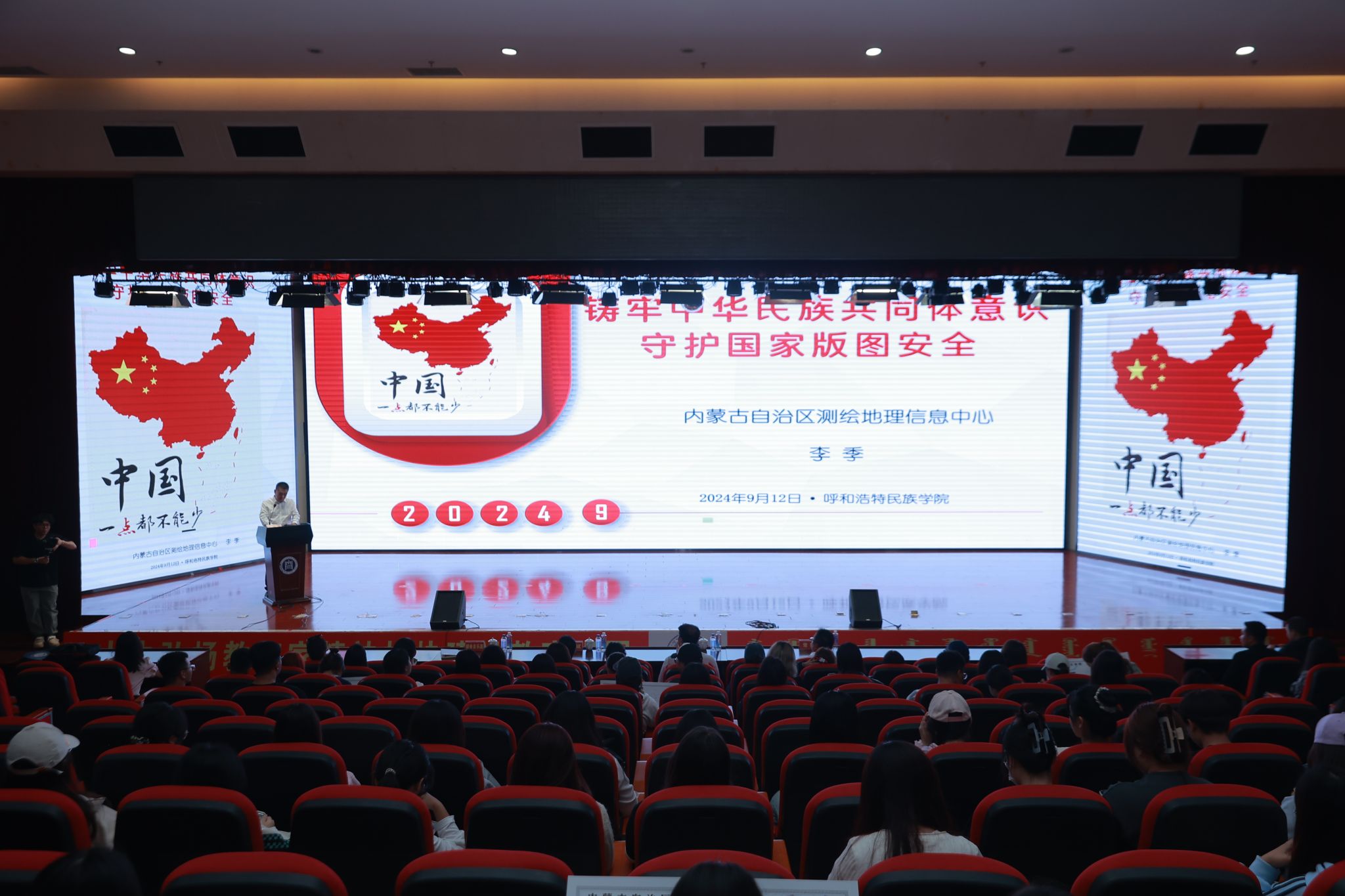 為深入學習貫徹黨的二十屆三中全會精神,貫徹落實習近平總書記關于加強和改進民族工作的重要思想,推動鑄牢中華民族共同體意識教育有形有效、走深走實,在第41個民族團結進步活動月之際,9月12日,學校黨委統戰部、學生工作部聯合自治區民委、自治區自然資源廳、自治區測繪地理信息中心在報告廳開展題為《鑄牢中華民族共同體意識 守護國家版圖安全》講座。自治區民委地方語言文字研究應用中心主任阿拉坦巴根那,內蒙古自治區測繪地理信息中心黨委委員、紀委書記梁世斌,學校學生工作部部長常喜出席。講座由學校黨委委員、統戰部部長朝格吉樂圖主持,600余名師生現場聆聽。