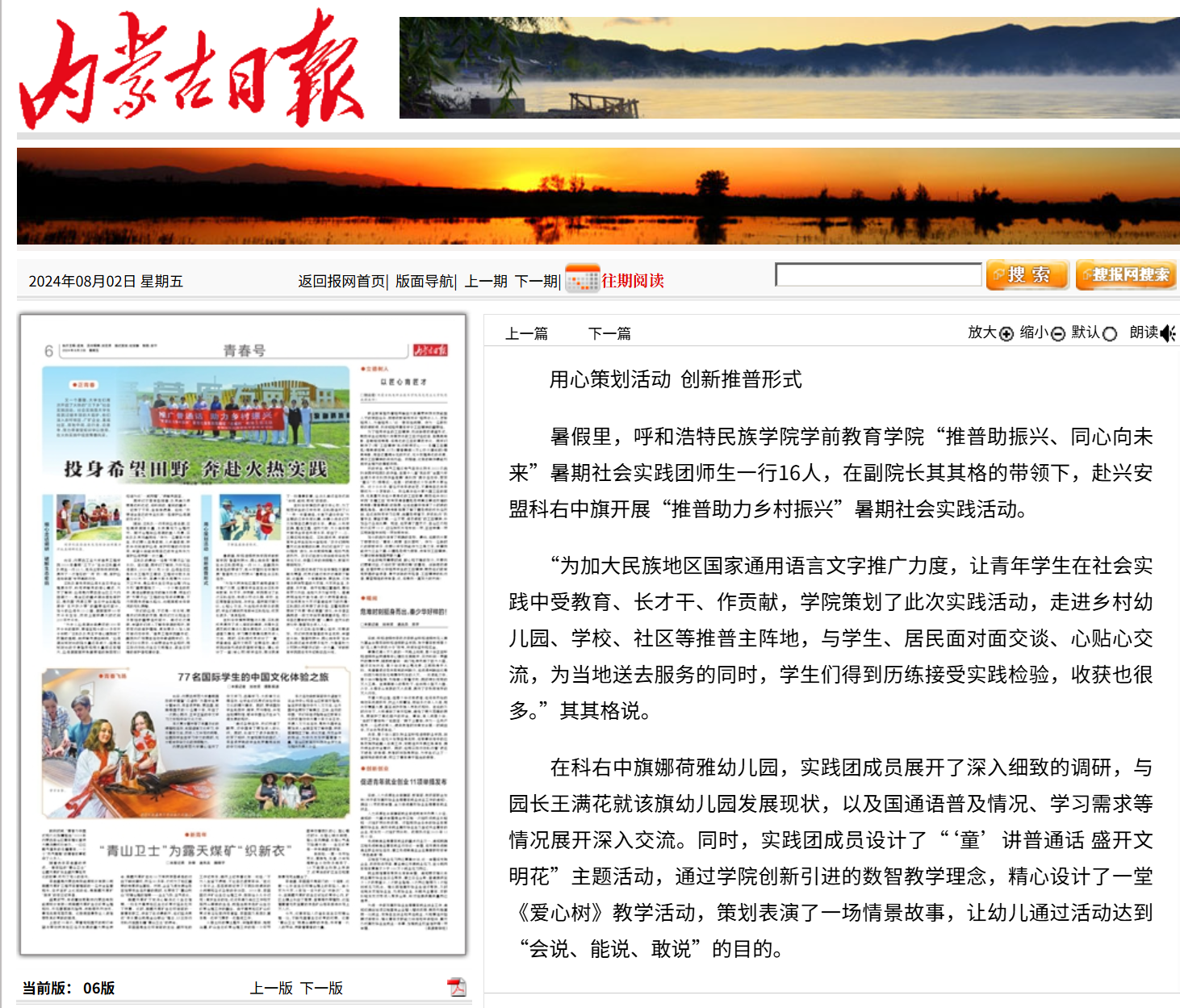 學院以黨團班一體化為抓手,聚焦鑄牢中華民族共同體意識主線,通過團日活動和學校一站式學生社區建設,構建五育融通、數字賦能的育人新生態。其中五線聯動?教育賦能實踐團組織47名師生分赴5個盟市,開展普通話推廣、民族團結教育等實踐活動,累計服務800余人次,獲地方政府高度評價,充分彰顯實踐育人成效。