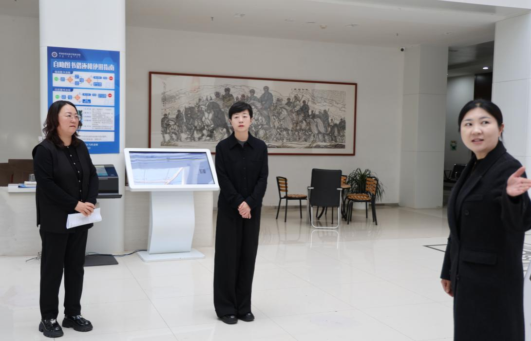 調研圖書館工作時,王敏深入圖書館各樓層了解文獻資源管理、空間利用效能及信息化基礎設施運行狀況,并與一線館員、讀者親切交流,聽取關于資源使用、服務體驗等方面的意見建議。座談會上,王敏充分肯定了圖書館在服務學科建設、教學科研和人才培養方面發揮的積極作用。她要求,圖書館要持續發揮職能職責,為學校文獻信息保障與學術服務提供堅實支撐。要堅持正確導向,嚴守意識形態主陣地;要聚焦能力提升,加強專業館員隊伍建設;要優化資源配置,提升文獻建設精準度;要夯實技術基礎,保障數字服務安全穩定;要強化宣傳推廣,切實提高資源利用效能。圖書館館長郝喜鳳就現階段工作成效和下一步工作計劃作了匯報。