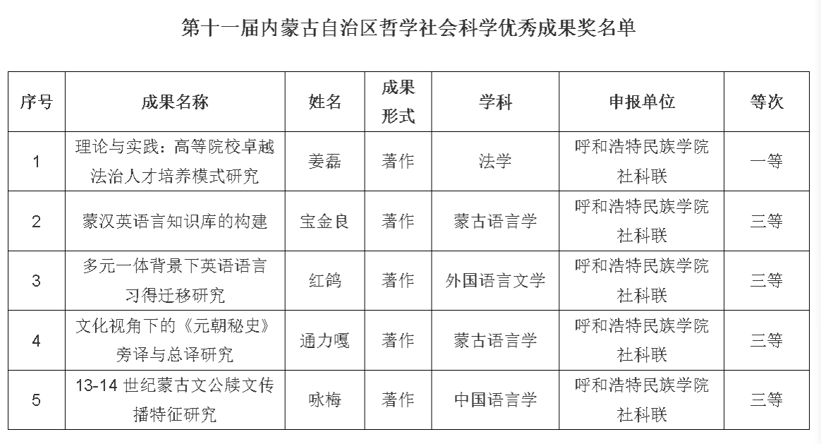 近日,內蒙古自治區(qū)社會科學界聯合會發(fā)布《關于第十一屆內蒙古自治區(qū)哲學社會科學獎評選結果的公示》,我校5項成果在本次評選中獲獎,其中一等獎1項、三等獎4項,實現了新的突破。