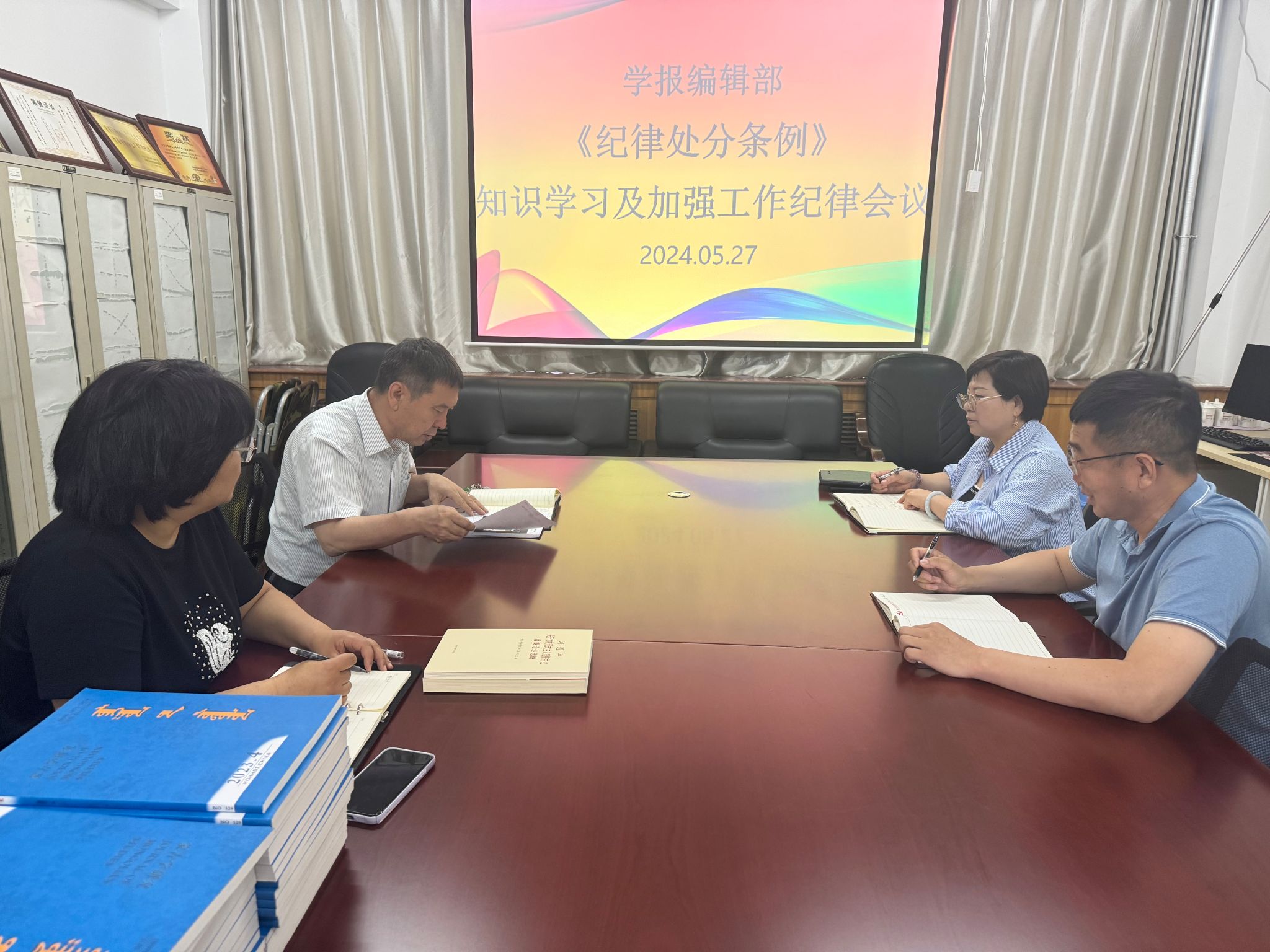 5月27日,學報編輯部召開了《中國共產黨紀律處分條例》專題學習及工作紀律會議,會議在學報編輯部數字出版室舉行,全體編輯部成員參加了本次會議。