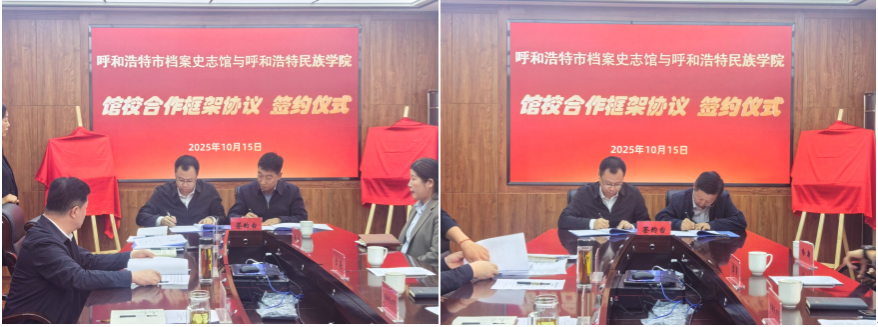 10月15日,我校管理學院與呼和浩特市檔案史志館于呼和浩特市檔案史志館三樓會議室,共同舉行了館校合作框架協議簽約儀式。呼和浩特市檔案史志館館長趙永強、副館長郝利忠和于溥源,以及我校管理學院院長哈斯同力嘎、教務處副處長青格樂圖等雙方代表一同參與了此次活動。
