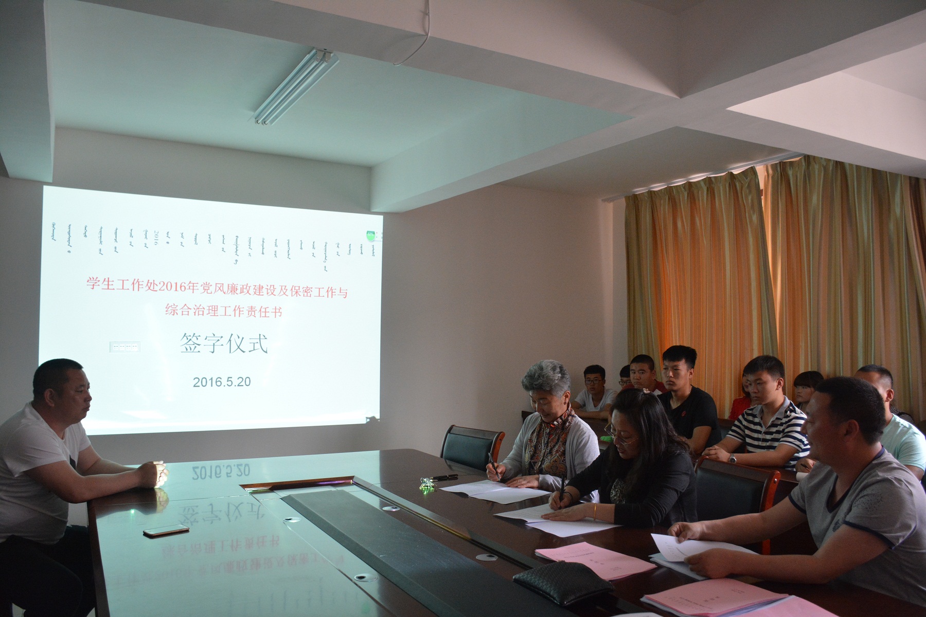 2016年5月20日下午4:30分,學生工作處在一號公寓會議室召開了2016年黨風廉政建設及保密工作與綜合治理工作專題會議。會議由學生處副處長包倉主持,學生處全體人員及自管會和宿管會部分成員參加了此次會議。