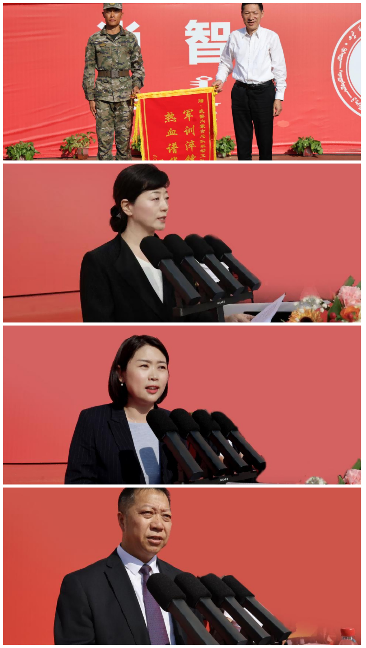 表彰先進環節,黨委副書記格根哈斯宣讀表彰決定,對優秀標兵、優秀教官和先進集體頒獎。主席臺領導為新生代表佩戴校徽,標志著他們正式成為“民院人”。教師代表烏格德勒、在校生代表張景雯及新生代表白興楠分別發言,共同表達“以奮斗踐行強國有我”的決心。