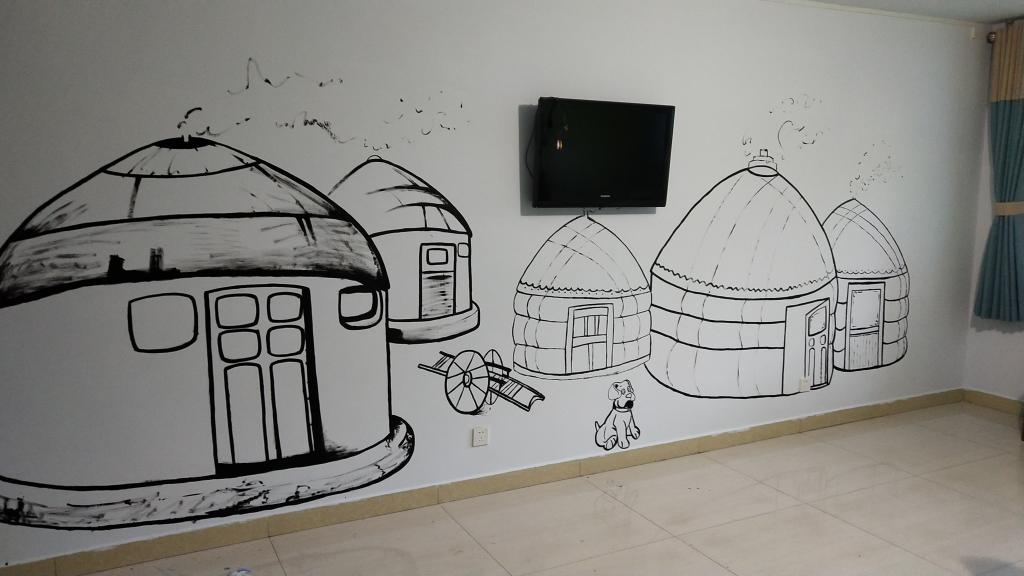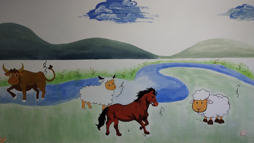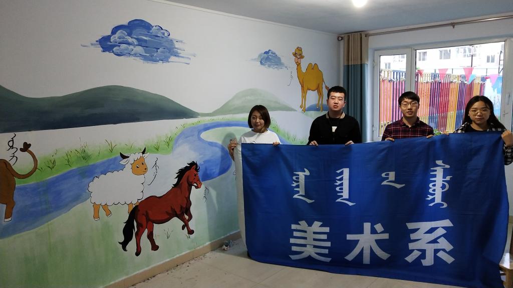本次活動充分發揮了美術系學生的專業特長,同學們為這所幼兒園墻體描繪出民族文化特色的圖案,從孩子的視野角度出發,在墻面上生動描繪了內蒙古地區的民族特色風貌以及草原上生活的動物,使從小生活在城市里的蒙古族小朋友能夠感受到草原的風貌,為孩子的心中種下民族團結的種子。