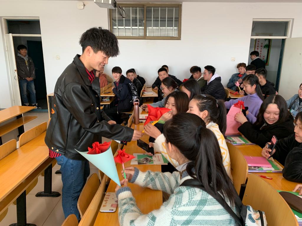 本次活動,主要由外語系男生選取喜歡的卡紙親手折紙花、紙心、千紙鶴等,為女生們送上自己的心意和祝福。活動前夕,為保證紙花折疊效果,男生們多次練習,直到制作出滿意的作品。活動過程中,男生們拿著折好的“鮮花”,逐一送給迎面走來的女生,送出真誠的祝福,并邀請路過的同學們在印有“活期現金余額寶,不如外語女生好”的宣傳條幅上簽下姓名和對女生們的美好祝福。活動現場精彩不斷,熱鬧紛呈。