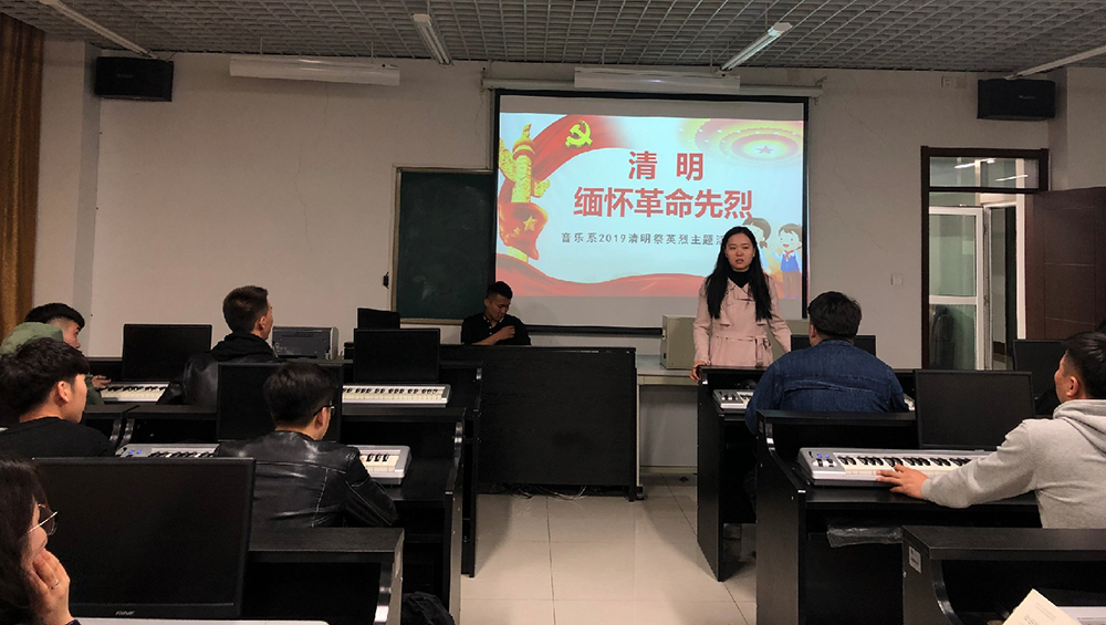 清明節凝結著中華民族的民族精神和民族情感,承載著中華民族的文化血脈和思想精華。為深切緬懷革命烈士的豐功偉績和崇高精神,弘揚傳承愛國主義精神,進一步增強學生的使命感與責任感,音樂系于2019年4月4日晚7時,在綜合樓403組織開展了清明祭英烈活動。活動由專職輔導員賽娜老師主持,團總支書記張超老師、學生黨員、學生骨干約四十余人參加。