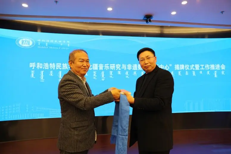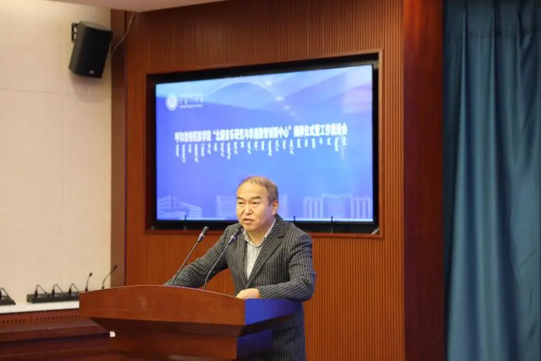 2025年11月13日下午,呼和浩特民族學院“北疆音樂研究與非遺數智創新中心”揭牌儀式及工作推進會在綜合樓1211(5號)會議室舉行。學校黨委委員、副校長雙虎,內蒙古自治區人大教科文衛委員會副主任委員吳海龍,內蒙古師范大學音樂學院楊玉成教授,江西科技師范大學音樂學院哈斯巴特爾教授等區內外專家、學者以及中國音樂學院、內蒙古師范大學、內蒙古藝術學院、呼和浩特民族學院音樂與舞蹈學院師生代表參加了會議。由音樂與舞蹈學院黨總支書記包玉柱主持。